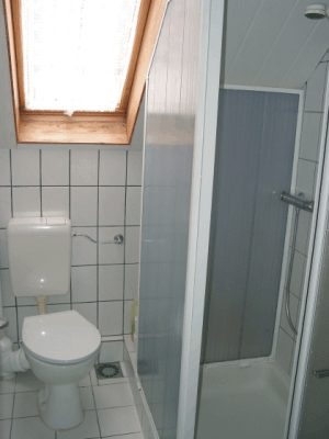 Zum Bad mit WC gehören ein Waschbecken und eine Dusche.