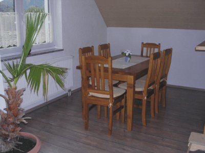 Eine rustikale Esstisch- Garnitur für bis zu 6 Personen befindet sich ebenfalls im Wohnbereich direkt am Fenster.