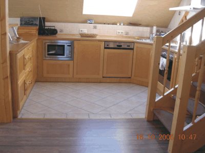 Zum Wohnbereich gehört ein großzügiger Koch- Bereich mit Mikrowelle, Kühlschrank, Spüle und Spülmaschine, Elektroherd mit Cerankochfeld, Kaffemaschine, Brotmaschine und Wasserkocher.