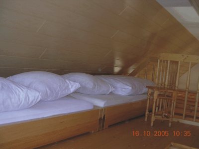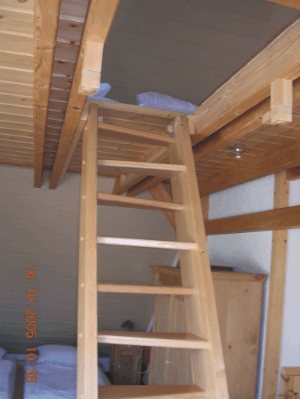 Der Schlafboden mit 2 Betten ist über eine stabile Holztreppe vom Schlafteil aus zu erreichen und bietet ebenfalls eine schöne Aussicht über Garten und die Berge.