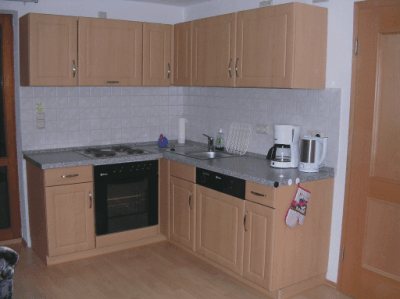 In der Kochnische im Wohnzimmer stehen Ihnen eine geräumige Arbeitsfläche, ein Elektroherd, eine Kaffemaschine, ein Wasserkocher sowie eine Spülmaschine zur Verfügung.