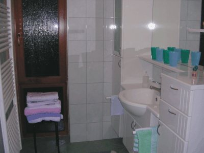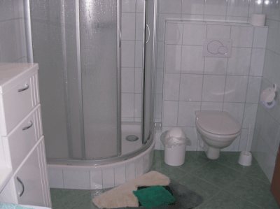 Das Bad ist mit einer Duschkabine, einer Toilette, einer Wasch- Schrankgarnitur und einem Handtuchtrockner ausgestattet.